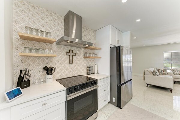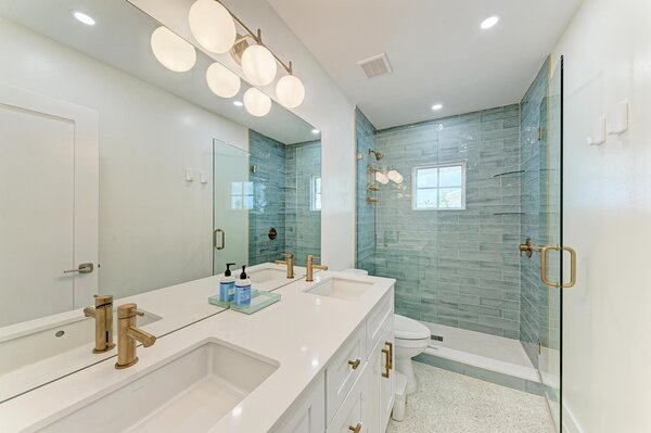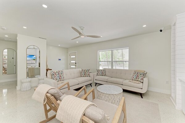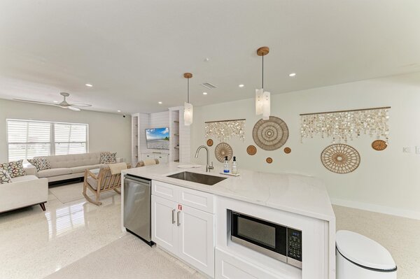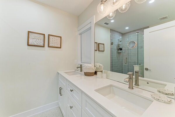 The master suite is a private retreat with a king bed and an ensuite bathroom featuring a sleek walk-in shower and dual vanities. Two additional bedrooms also feature king beds and share a hallway bathroom with a walk-in shower, offering comfort and convenience for family or guests. For added flexibility, the living room includes a twin pullout bed. Having all king beds makes "Casa Spoonbill" the perfect choice for couples, families, or groups seeking both comfort and privacy.