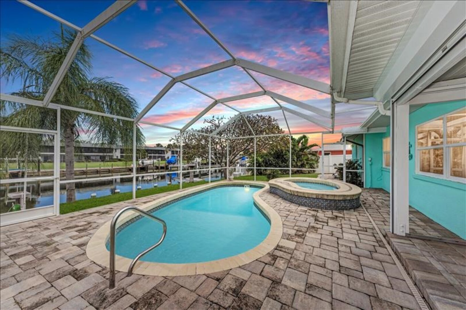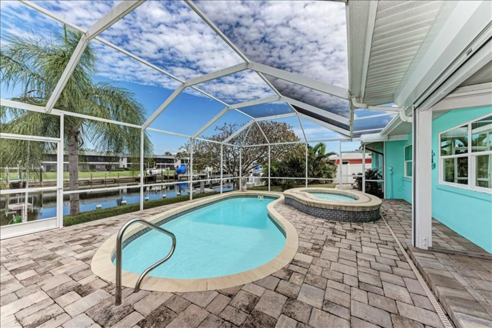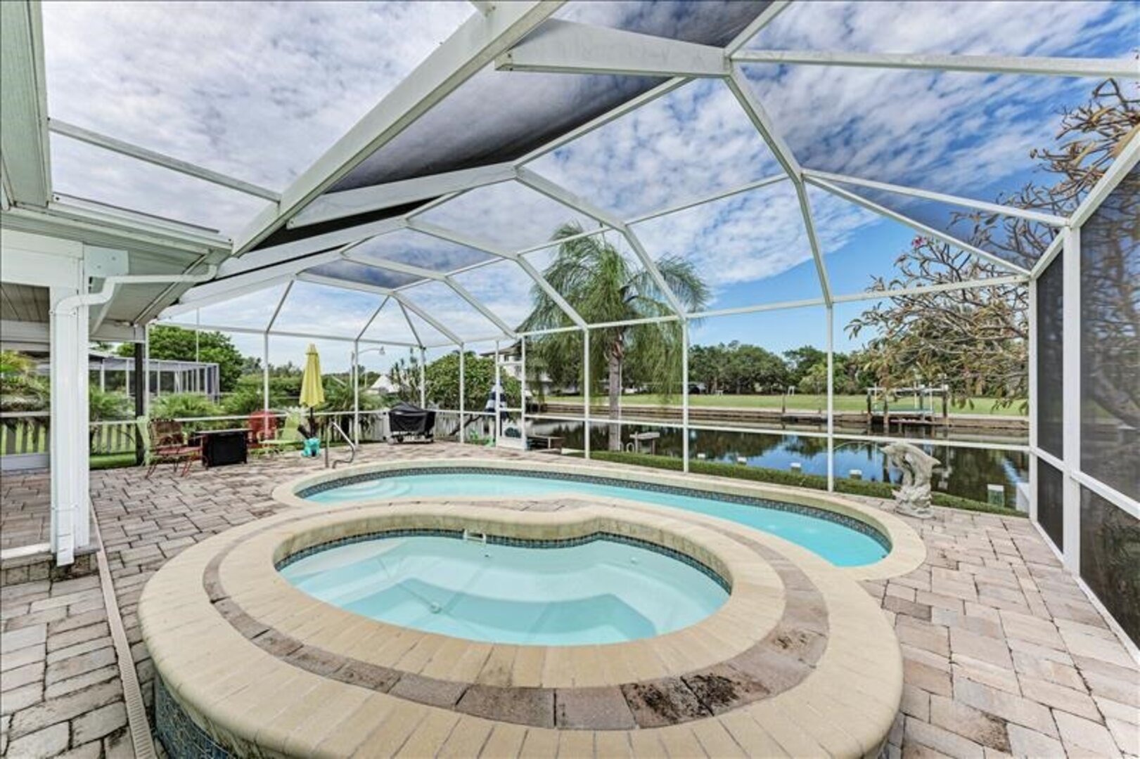 The lanai/pool deck is screened in with pavers and the spa is heated. Outside the screened area, pavers lead to the fishing dock that has a seating area to enjoy sunsets and catch a glimpse of the occasional dolphin or manatee in the water.