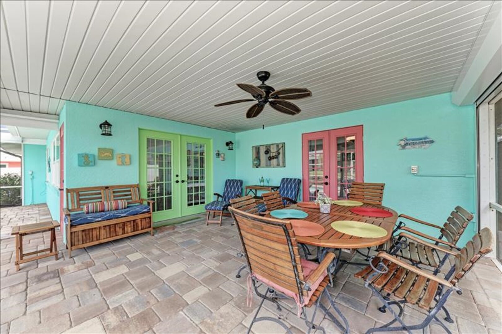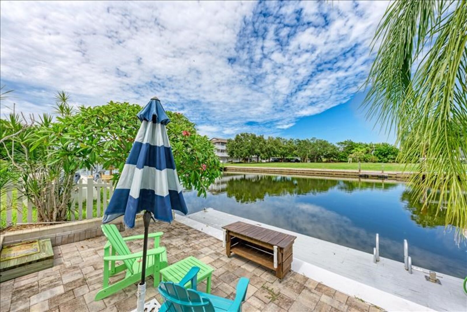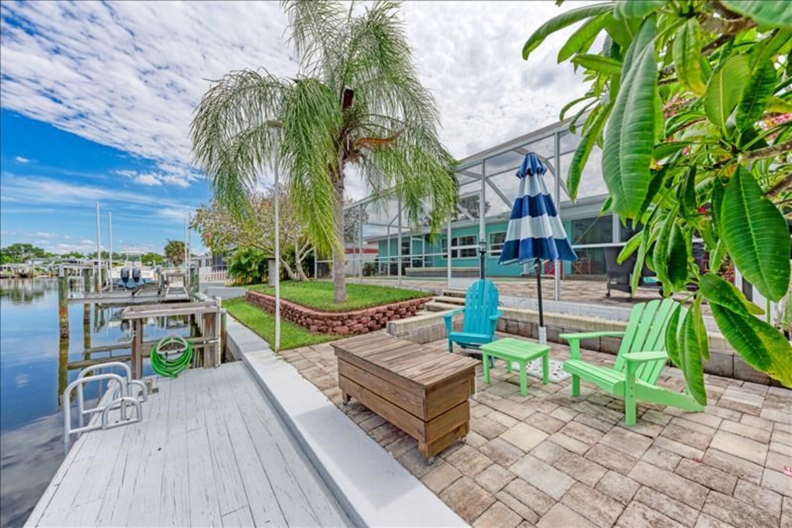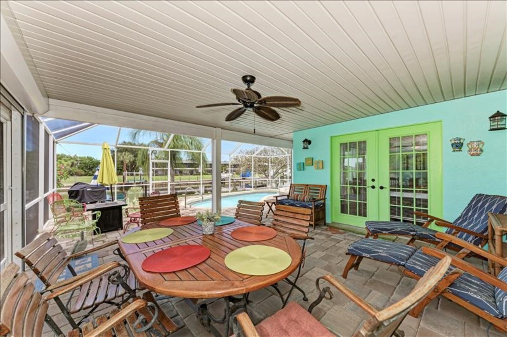 The lanai/pool deck is screened in with pavers and the spa is heated. Outside the screened area, pavers lead to the fishing dock that has a seating area to enjoy sunsets and catch a glimpse of the occasional dolphin or manatee in the water.