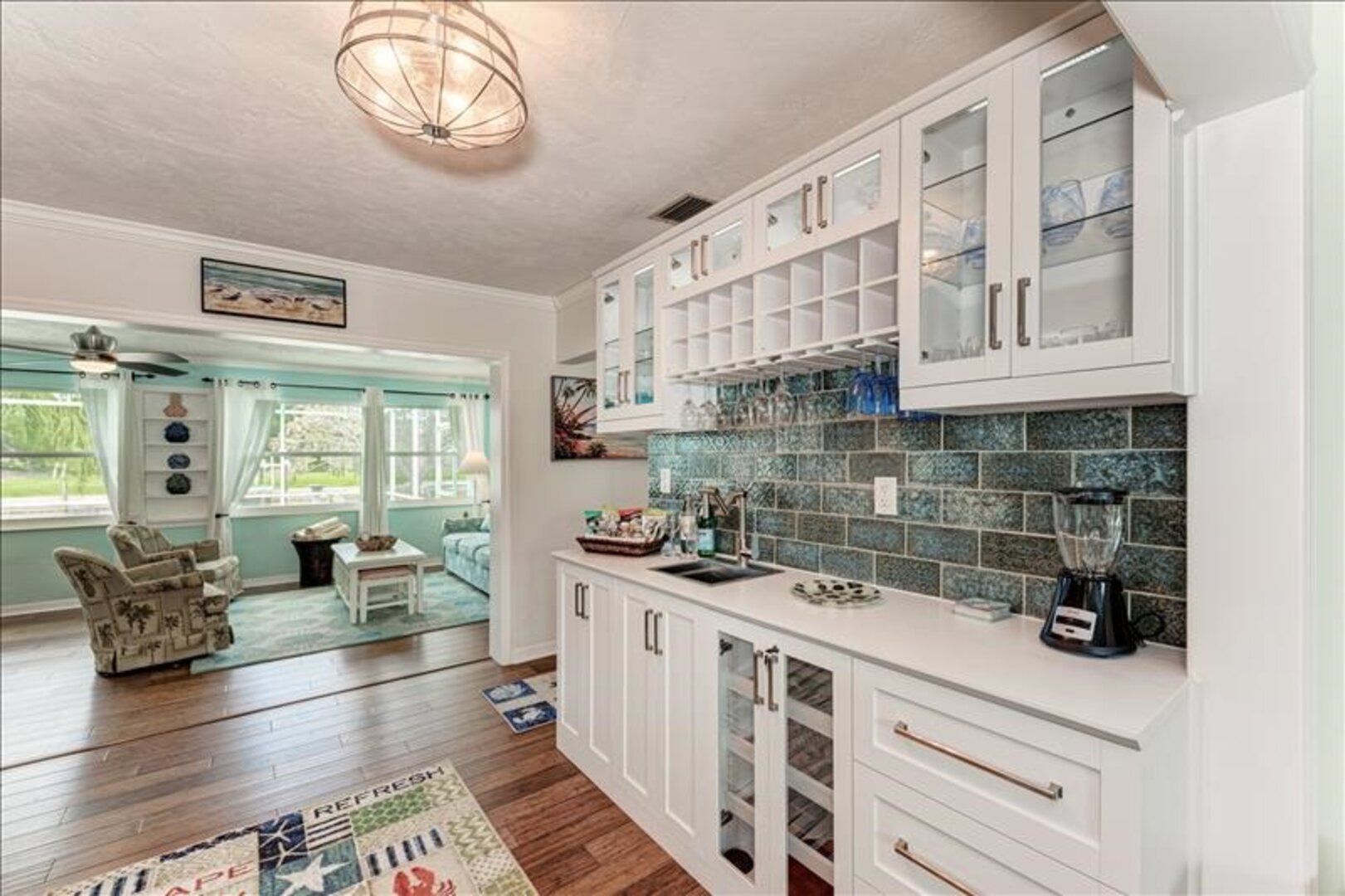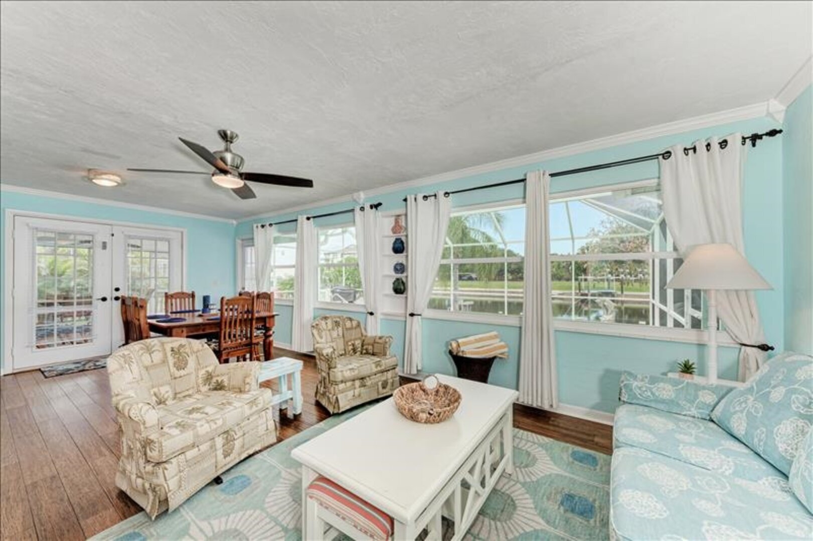 This property features a split open floor plan. Upon entering there is a formal living room and two nice sized bedrooms. These bedrooms are separated by a guest bath that offers a tub/shower combo. One bedroom offers a queen-sized bed, and the other guest room offers 2 twin beds (bunkbed) and a twin a trundle. From the living room you have a flowing, open concept that allows you to see through to the water as you enter the custom kitchen and wet bar. The wet bar is adjacent to the family room which offers tons of natural light and views of the pool/spa and canal. The owner’s retreat is just off the family room and offers a king-sized bed, ensuite bathrooms and a view of the canal. The master bath features an oversized soaking tub with shower and double sink vanity.
