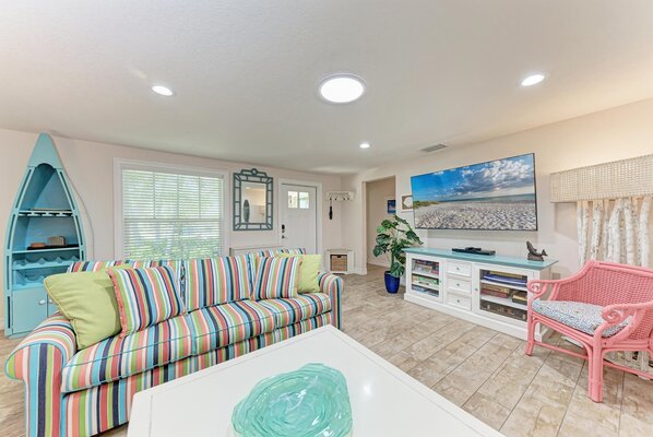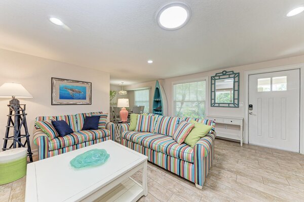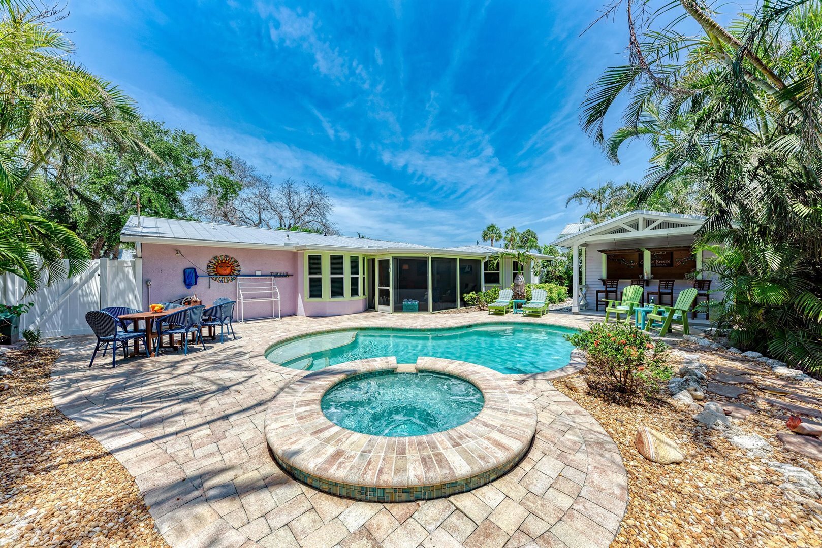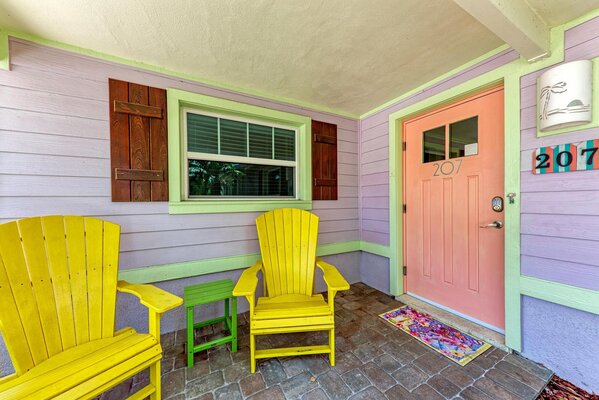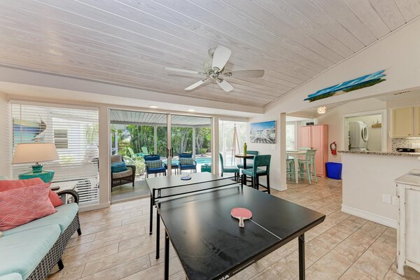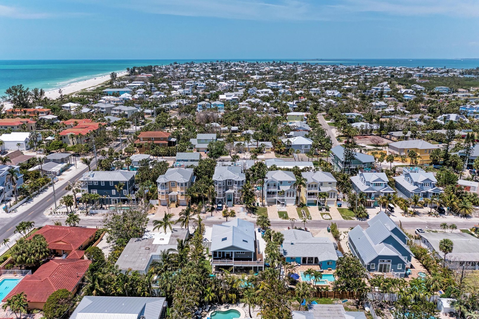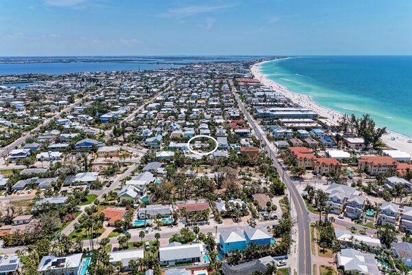 This vibrant four-bedroom, three-bathroom island retreat is your perfect vacation escape on AMI. The backyard is a true highlight, featuring a private heated pool with spa, cozy and colorful seating areas, and a one-of-a-kind tiki bar that is ideal for sipping tropical drinks and living the island lifestyle. Plus, you're just seven homes away from the stunning Gulf beach access!