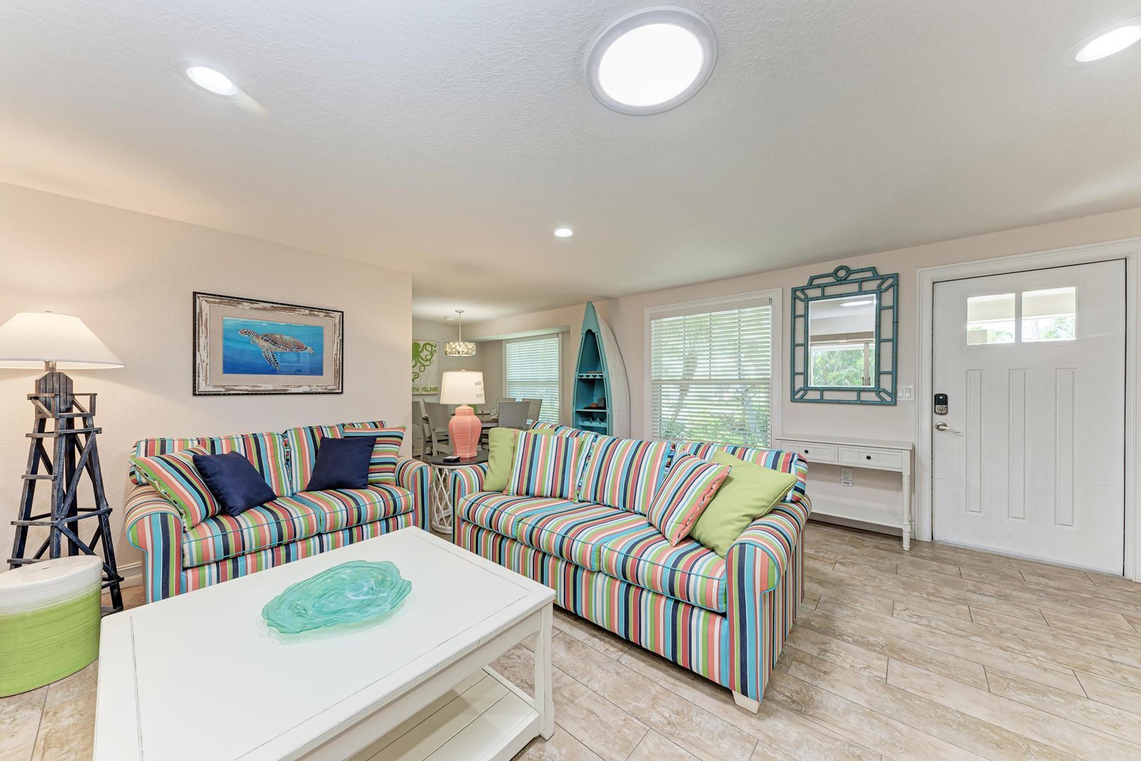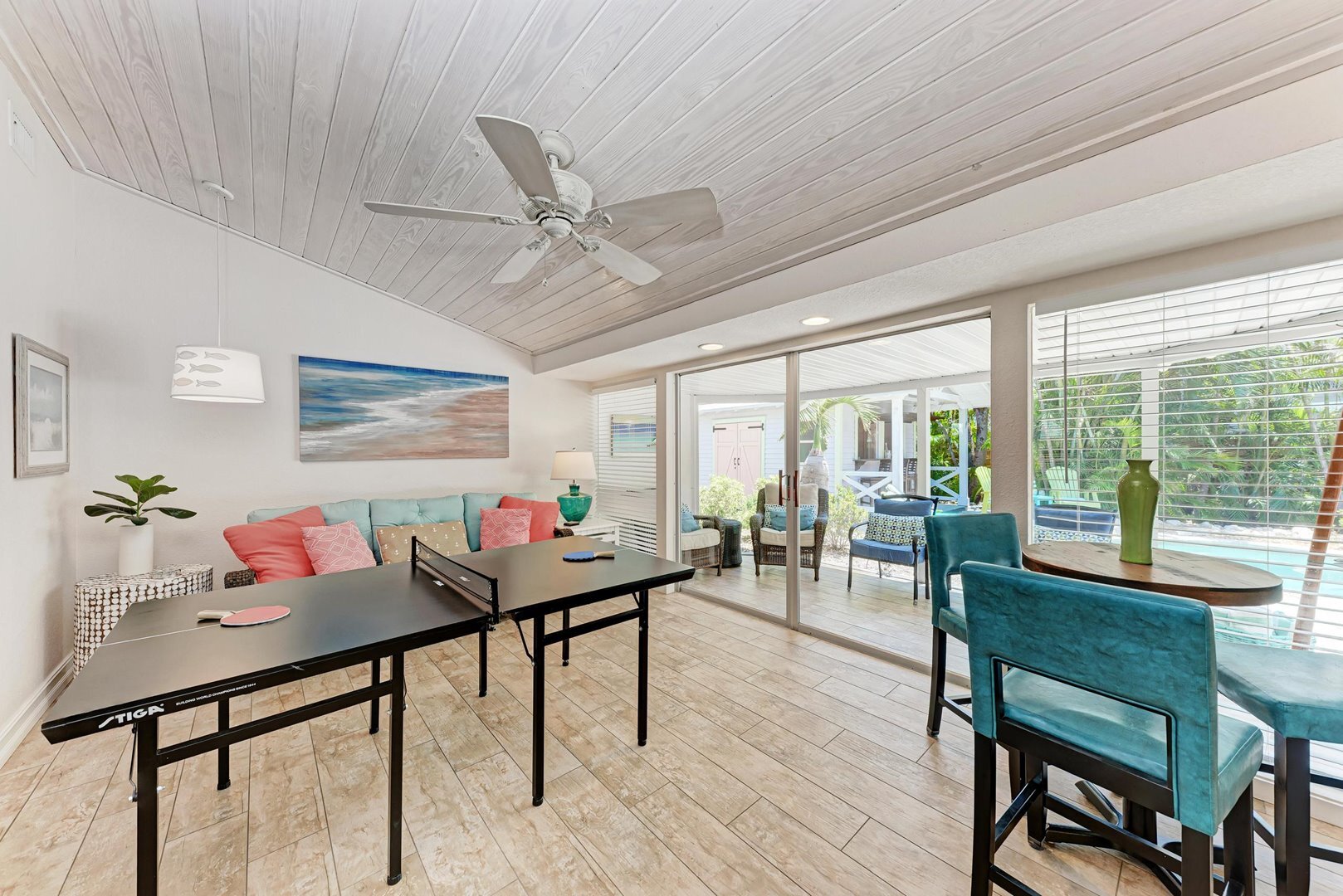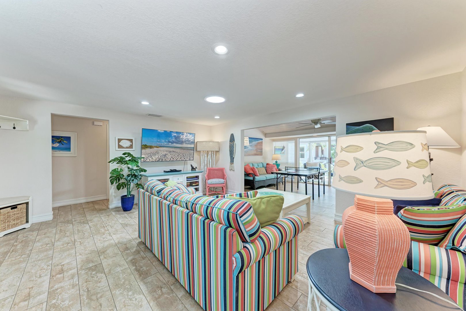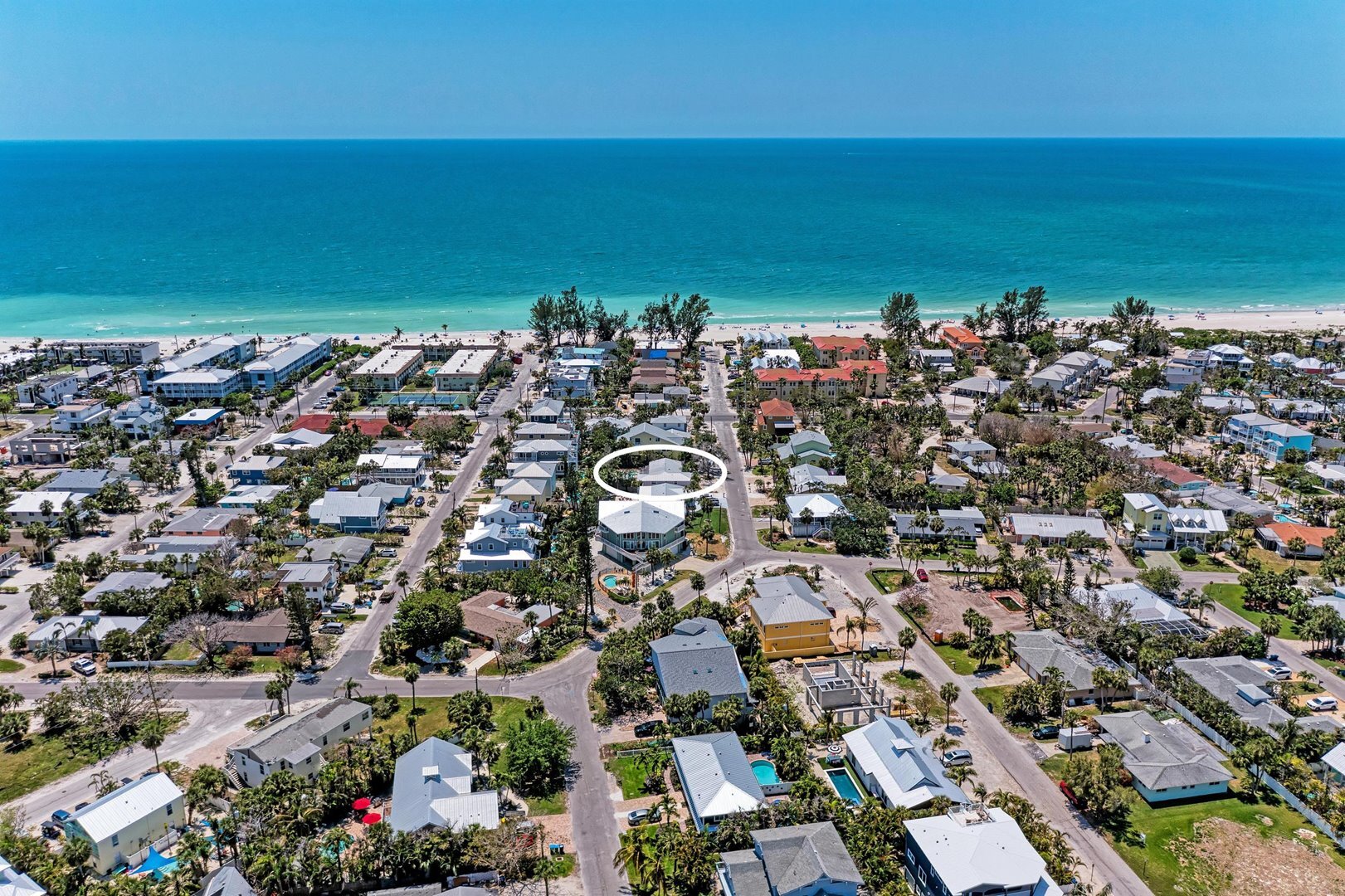 This vibrant four-bedroom, three-bathroom island retreat is your perfect vacation escape on AMI. The backyard is a true highlight, featuring a private heated pool with spa, cozy and colorful seating areas, and a one-of-a-kind tiki bar that is ideal for sipping tropical drinks and living the island lifestyle. Plus, you're just seven homes away from the stunning Gulf beach access!
