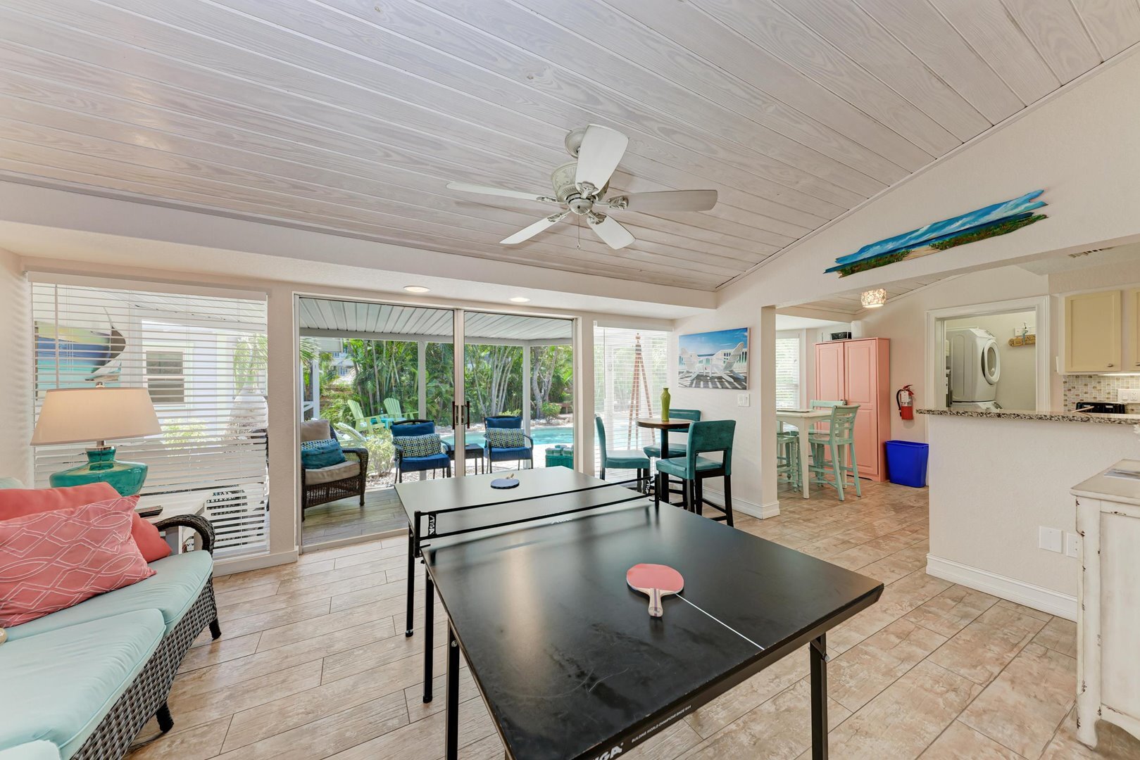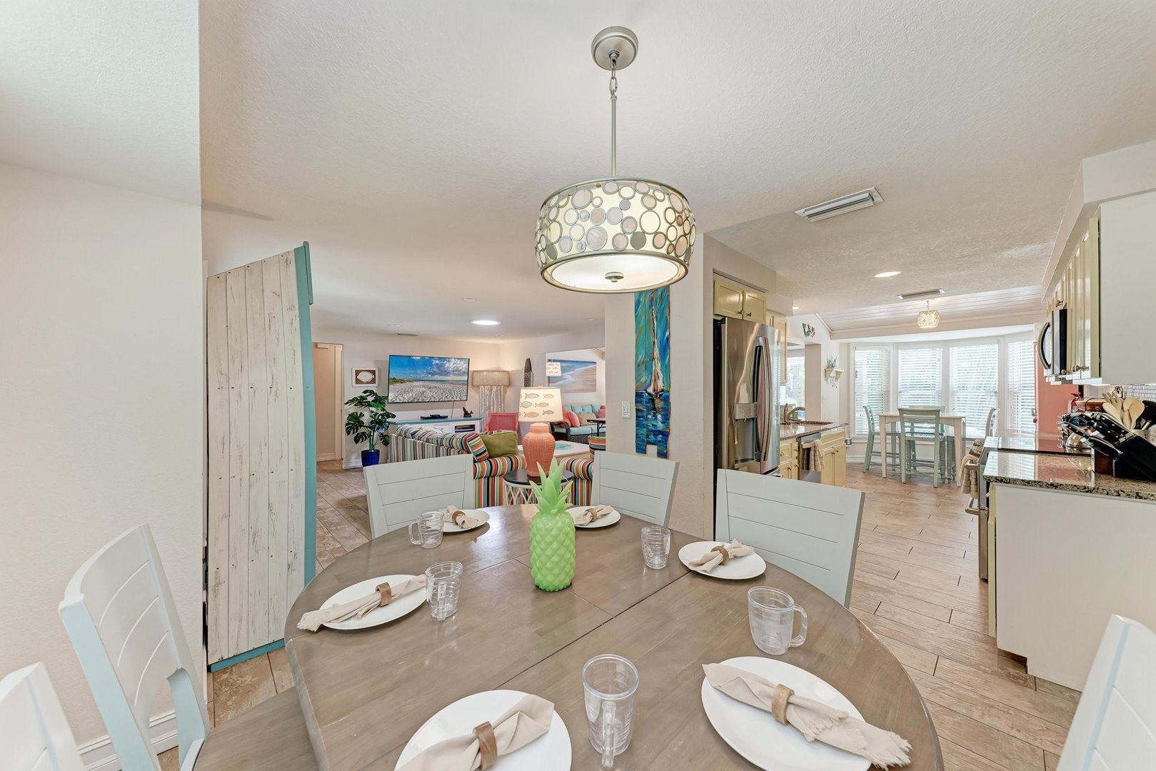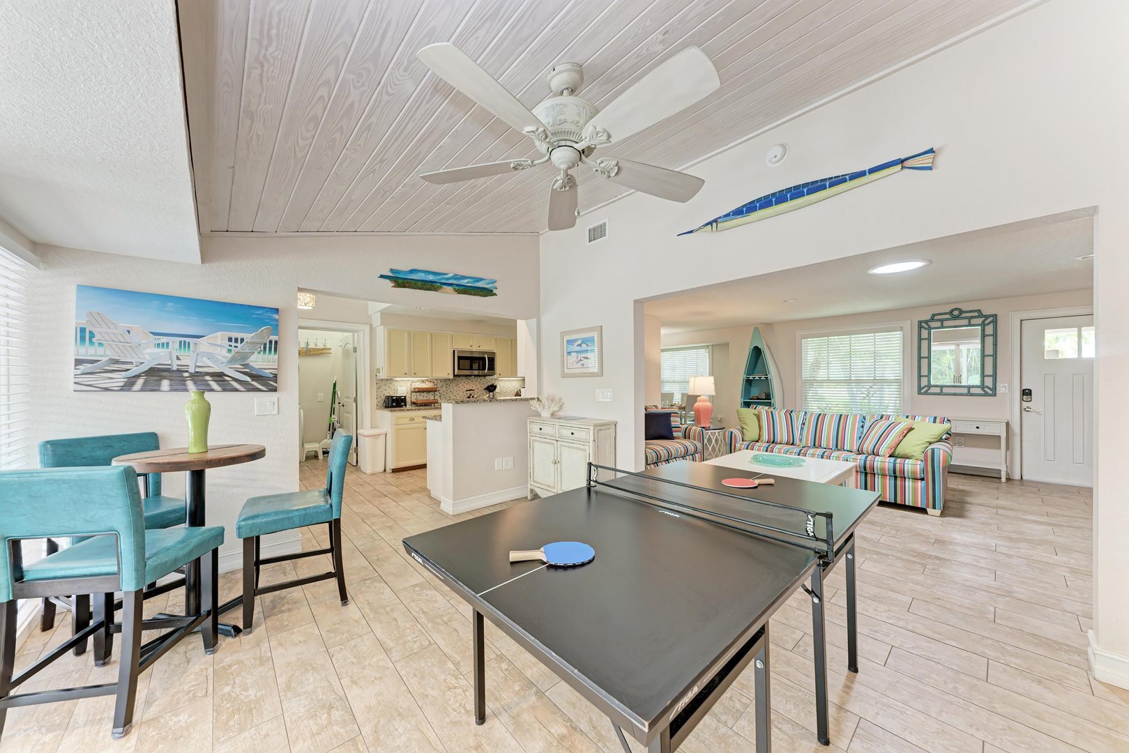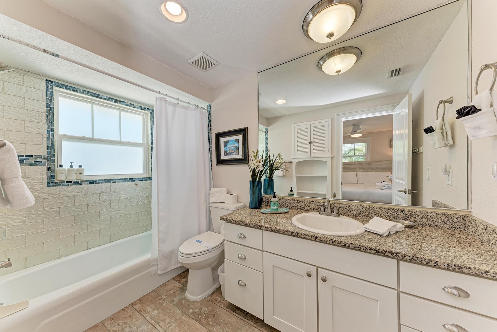 “Coastal Breeze” is styled with a cheerful beach theme throughout. Guests will find plenty of space to relax in the inviting living room, family room, and screened lanai. The fully equipped galley kitchen boasts stainless steel appliances, granite countertops, and all the cooking essentials to make meal prep a breeze. Enjoy meals together at the kitchen table, the indoor dining area, or outside under the sun, where a gas grill awaits your fresh-caught seafood.