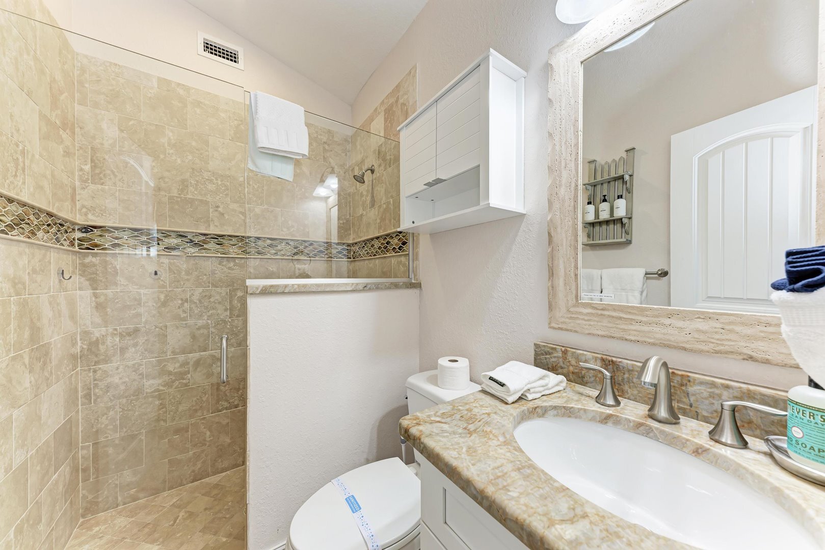 Primary Bedroom: King bed, ensuite bathroom with walk-in shower
