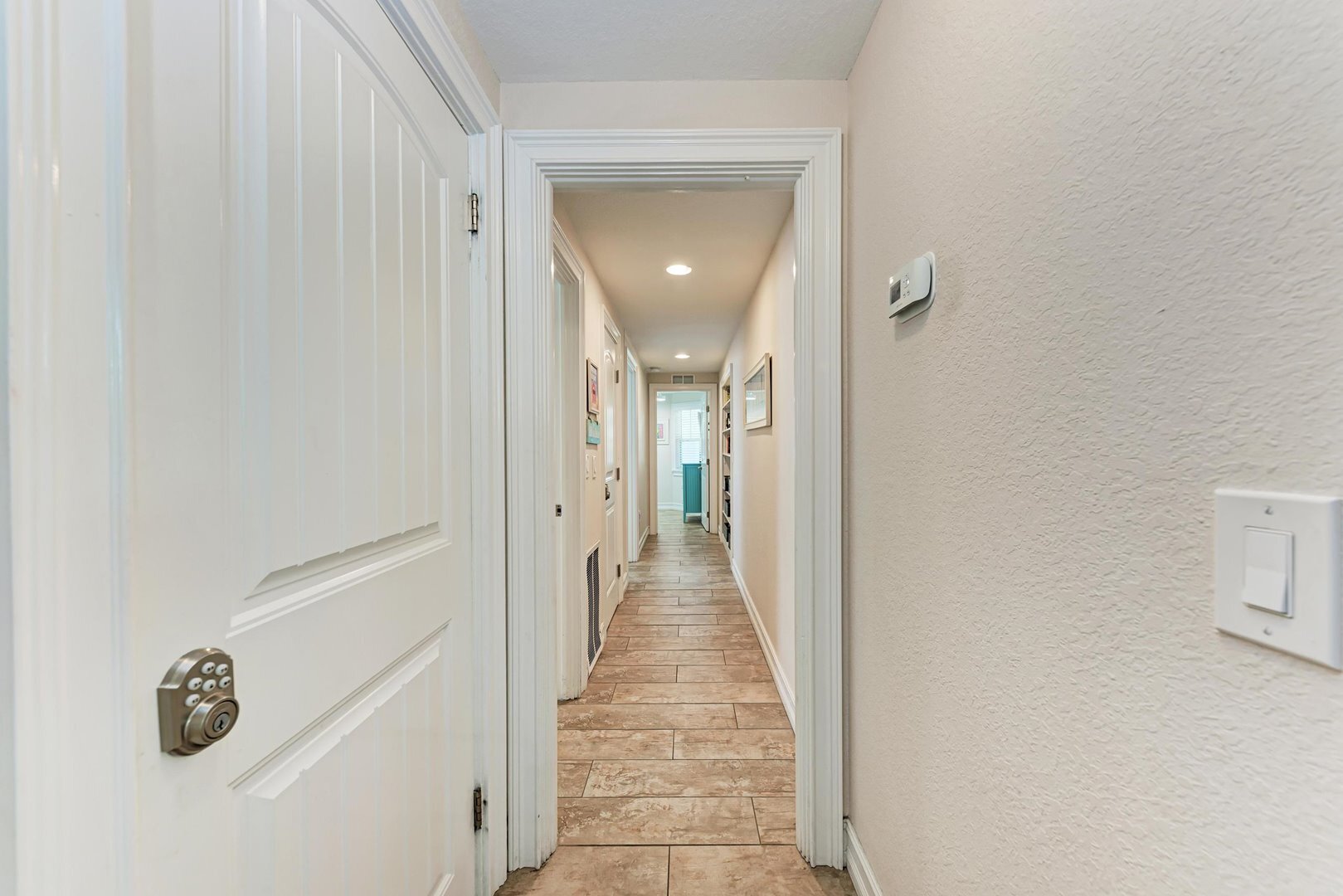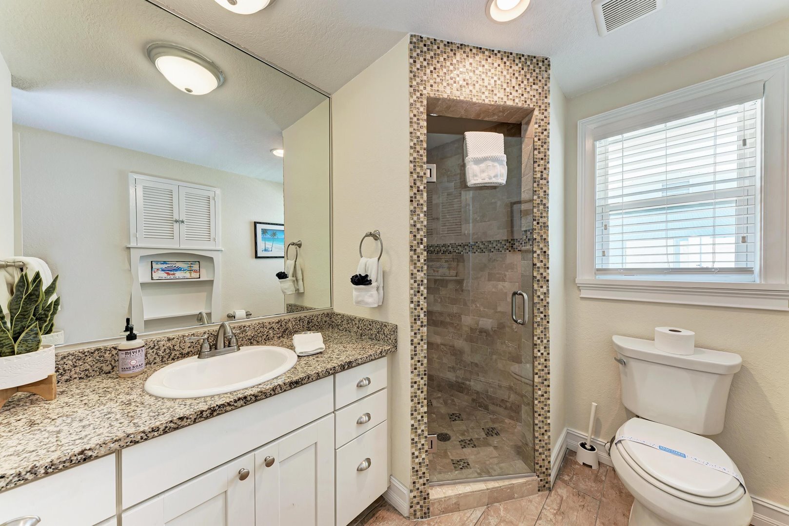 Each of the four bedrooms is designed for comfort and tranquility. The primary and second bedrooms both feature king beds, bright and breezy decor, ensuite bathrooms with walk-in showers, and luxury Salty Mermaid linens for a restful night’s sleep. The third bedroom offers a cozy queen bed, while the fourth is perfect for kids or extra guests with a Twin over Full Bunk Bed with twin trundle bed underneath. These rooms share a hallway bathroom with a walk-in shower. A washer and dryer are also available for added convenience.