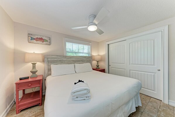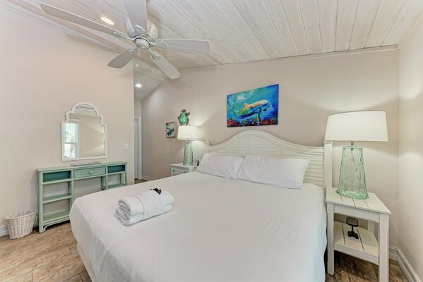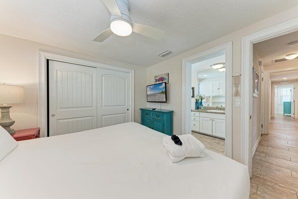 Second Bedroom: King bed, ensuite bathroom with walk-in shower