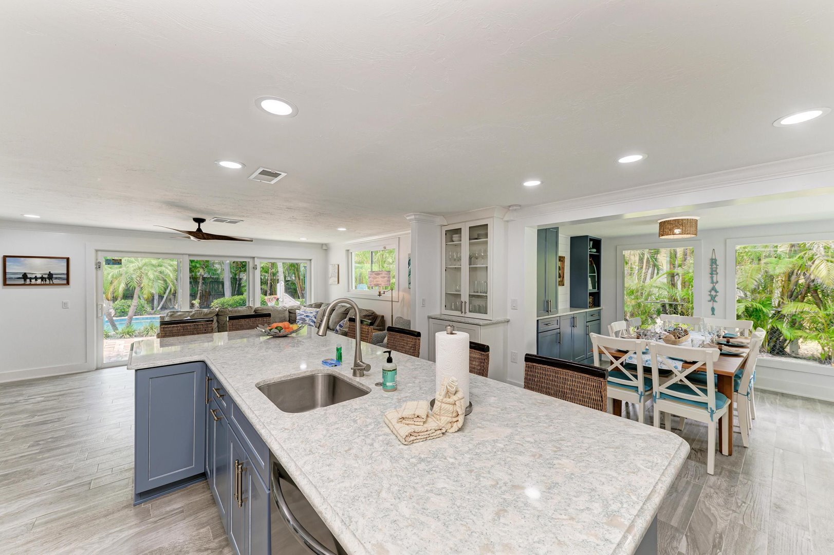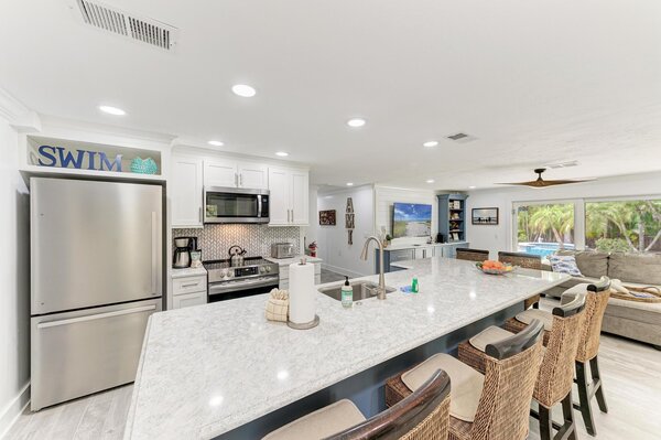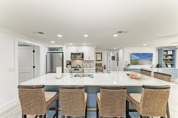 The large open floor features the newly updated kitchen with quartz counters, large breakfast bar plus dining room and living room that offers a perfect gathering spot for family and friends. The comfy living room offers a great spot to sit back and relax after a long day at the beach.