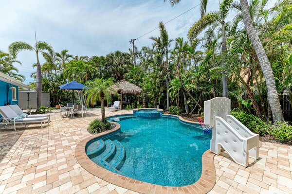 Leave the car parked in one of the 4 spots provided - the town is very walkable and one of our island free trolley stops is only a block away. Experience this beautiful private home just steps from the white sandy beaches of Anna Maria Island. The furnishings are comfortable and welcoming. Enjoy the newly installed outside shower, backyard tiki hut and heated pool/spa plus the gorgeous lounge area.