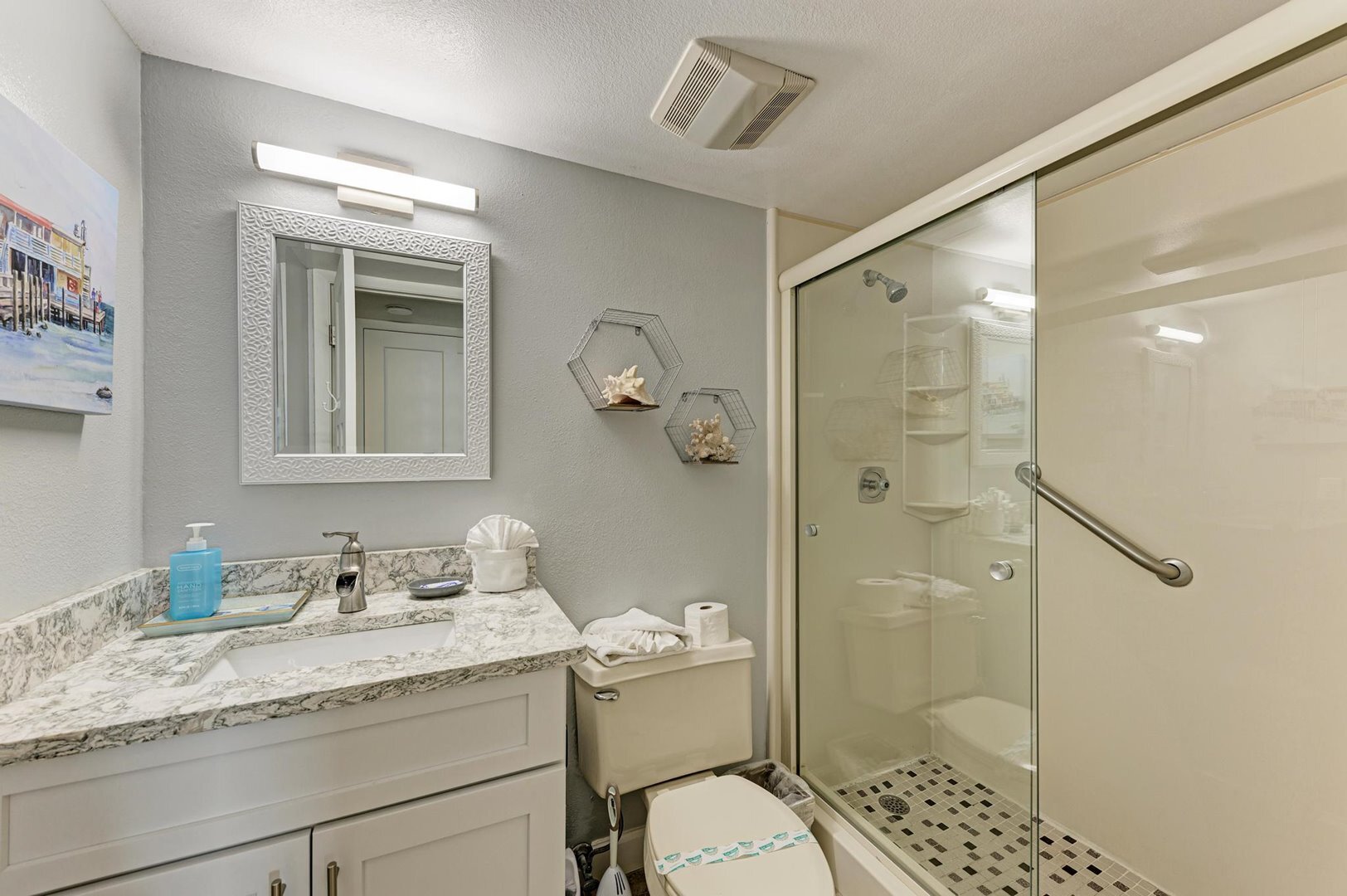 *A starter kit of paper towels, toilet paper, trash bags, laundry detergent, and coffee & tea. Full sized luxury hand soap, shampoo, conditioner, and body wash are provided at check-in. Also available if requested, while supplies last, is a toothbrush and sewing kit. Any additional items that you may need during your stay can be purchased at one of the local grocery stores.*