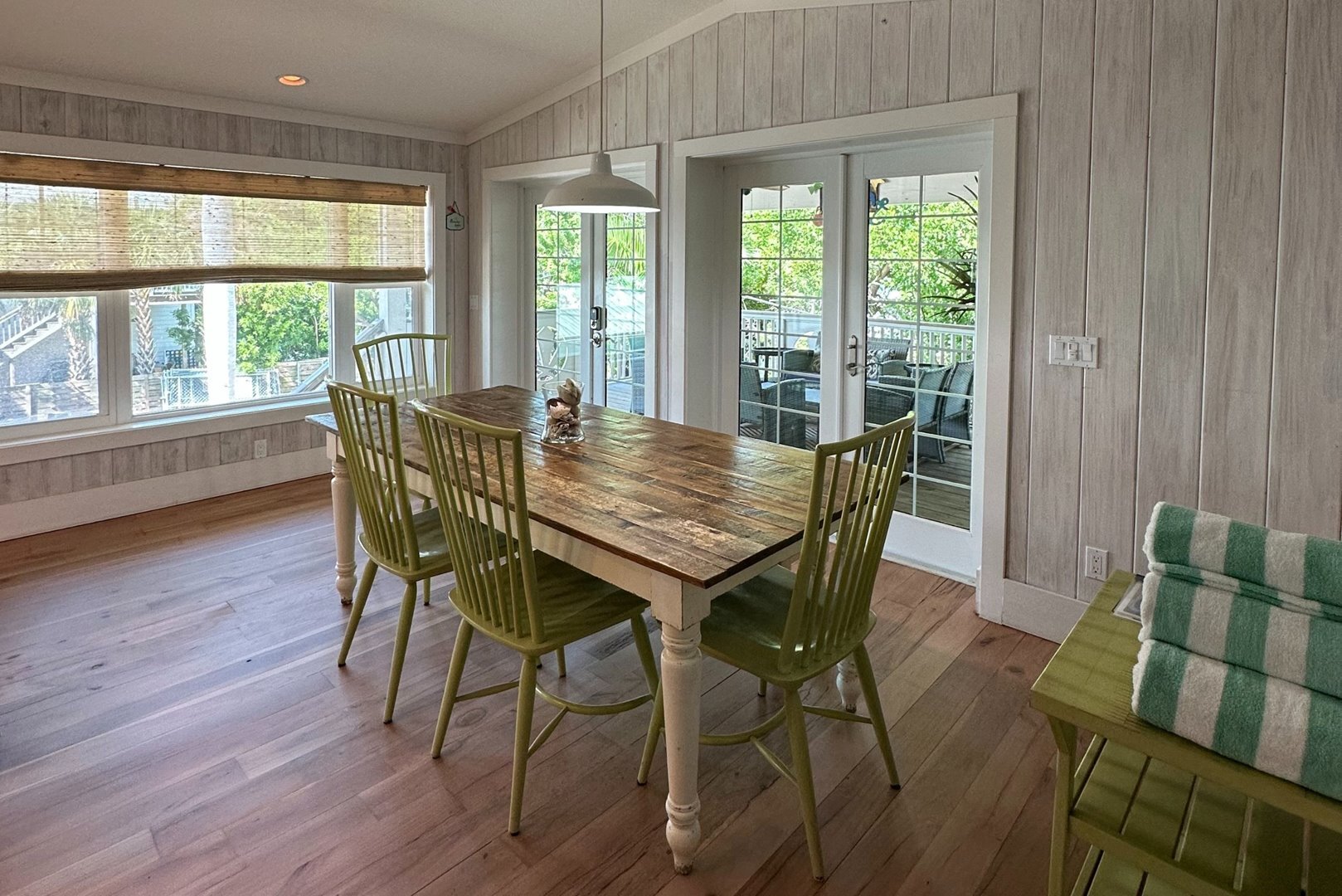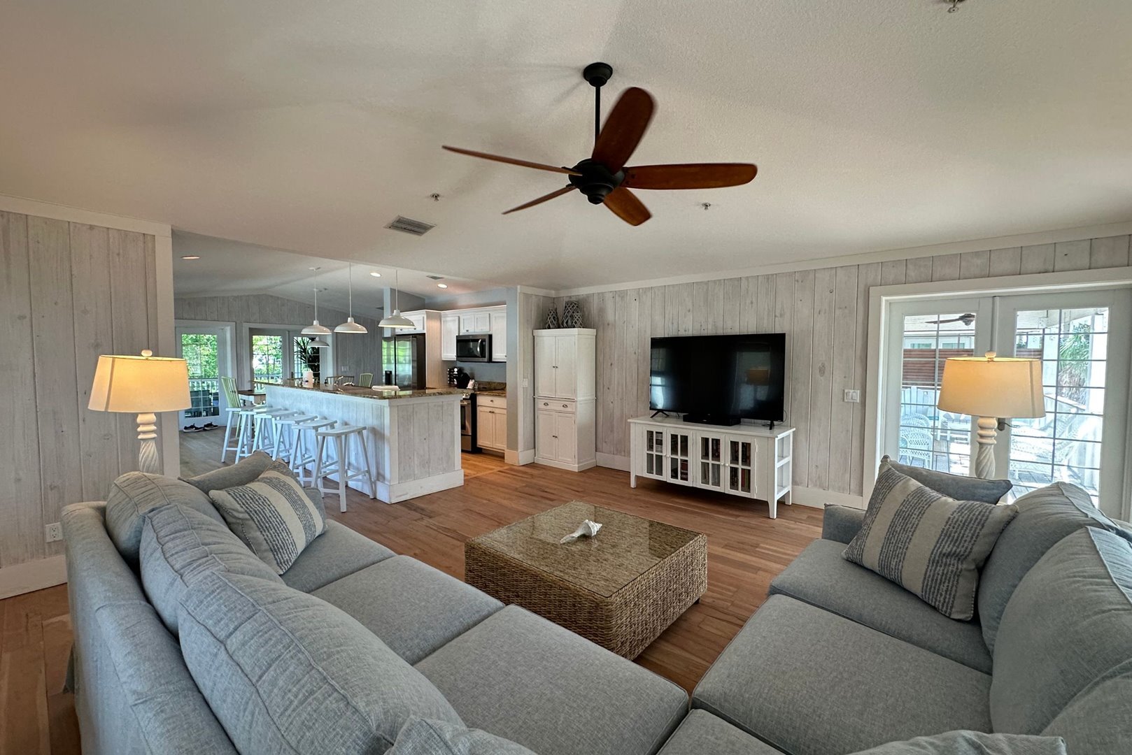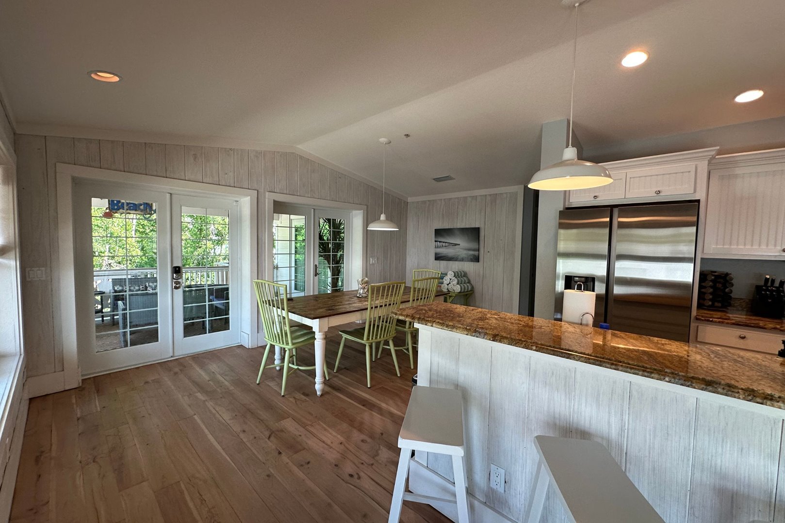 Step inside to a breezy, open-concept living space featuring recycled distressed wood floors and cozy coastal furnishings. The living area is open and inviting, featuring beachy distressed wood floors, comfortable coastal furnishings, a queen sleeper sofa, and a brand new smart flat screen TV. A Sonos speaker is available for streaming your favorite music or shows. Two sets of French doors in the dining area open to the spacious back porch that overlooks the pool – the ideal spot to relax or entertain.