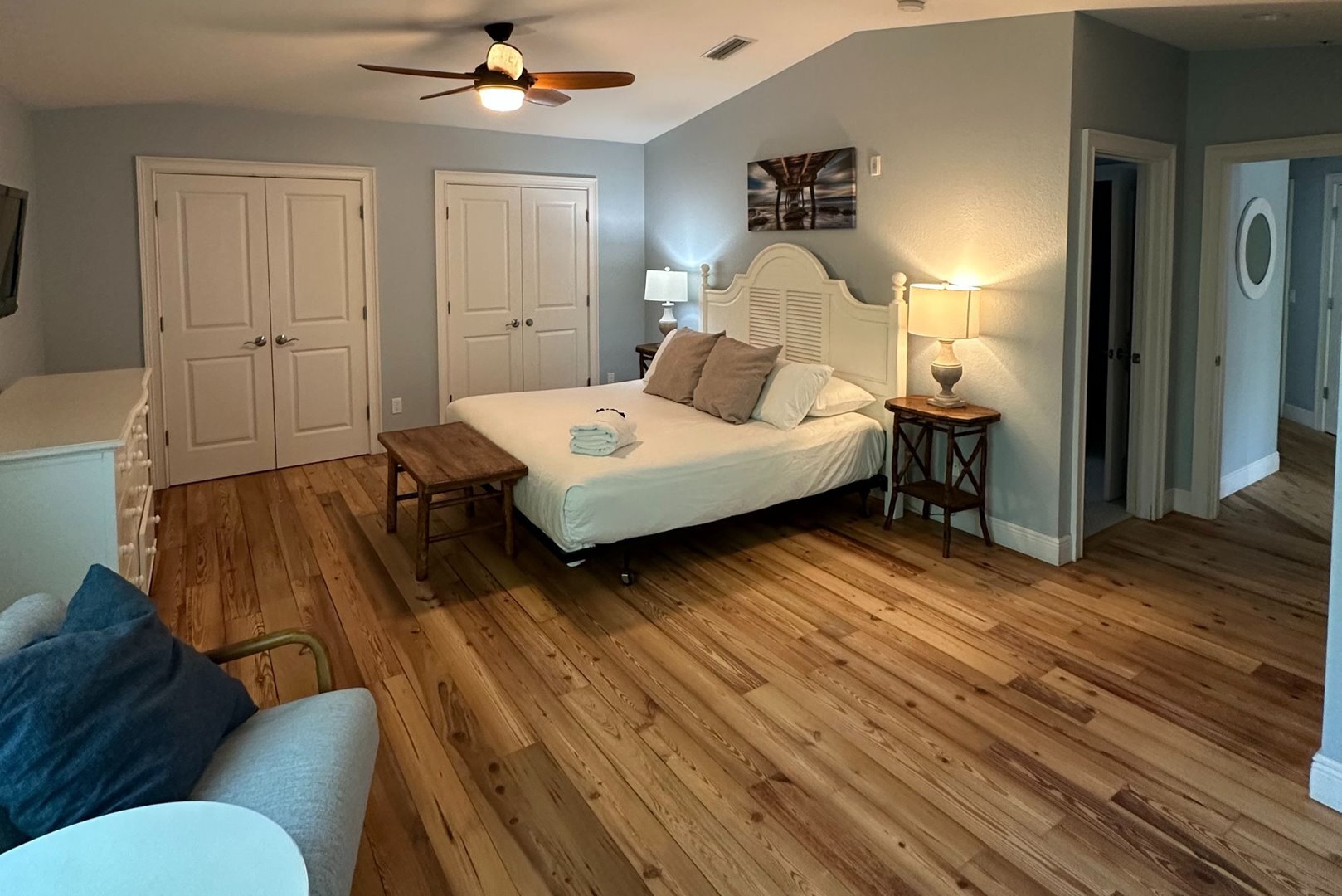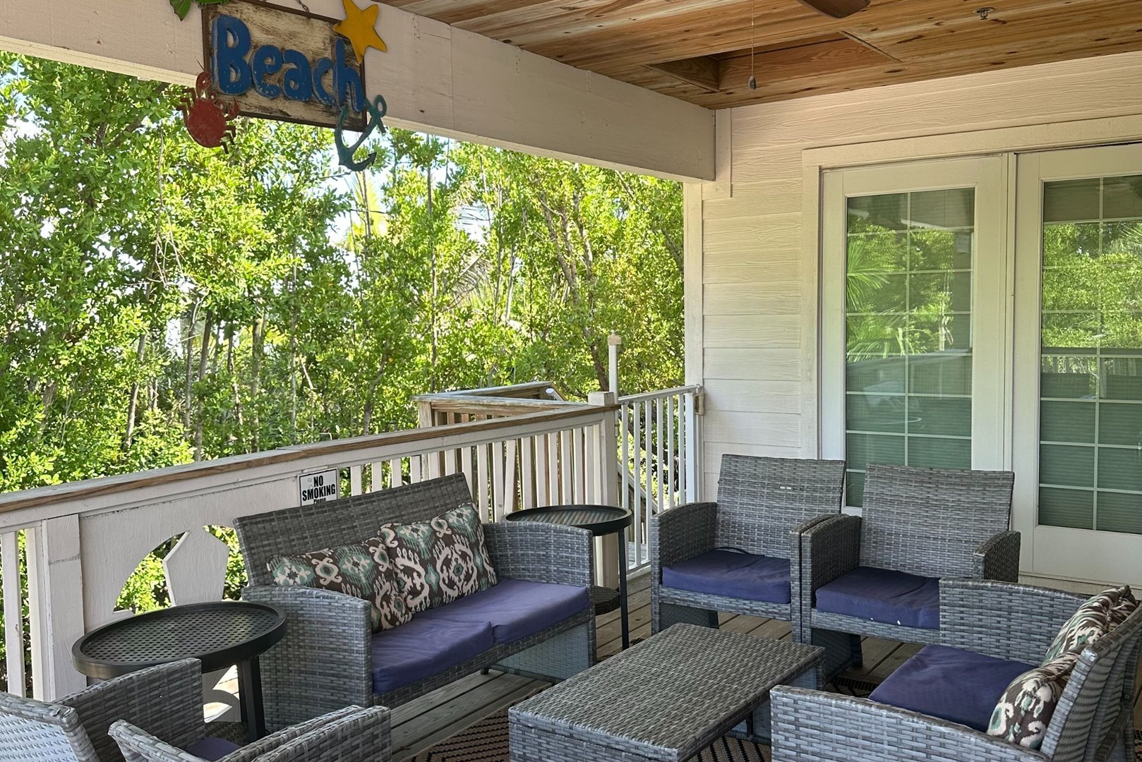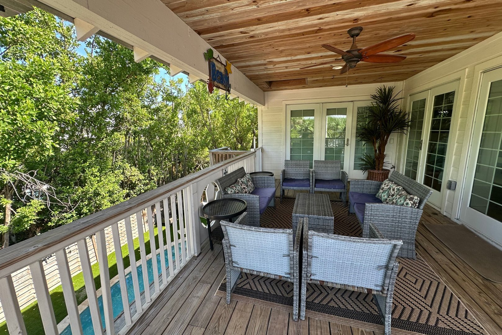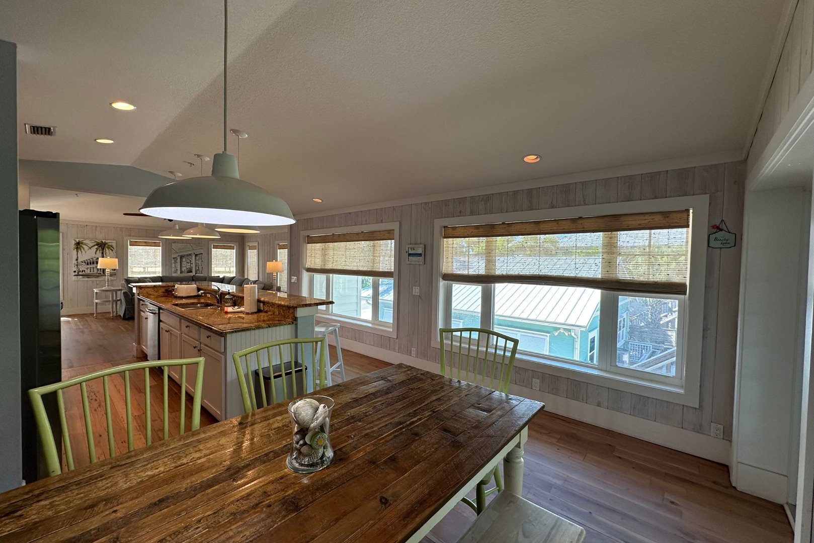 Step inside to a breezy, open-concept living space featuring recycled distressed wood floors and cozy coastal furnishings. The living area is open and inviting, featuring beachy distressed wood floors, comfortable coastal furnishings, a queen sleeper sofa, and a brand new smart flat screen TV. A Sonos speaker is available for streaming your favorite music or shows. Two sets of French doors in the dining area open to the spacious back porch that overlooks the pool – the ideal spot to relax or entertain.
