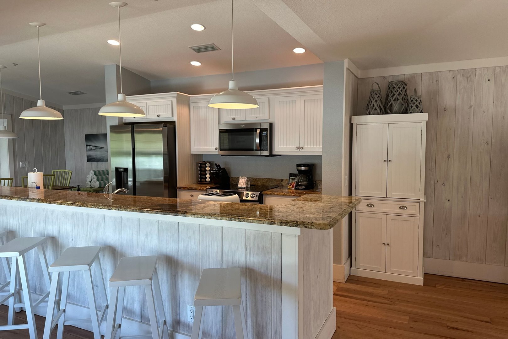 The fully stocked kitchen includes granite countertops, stainless steel appliances, and all the essentials for cooking and dining. The breakfast bar seats 6, and the dining table accommodates up to 8 guests.