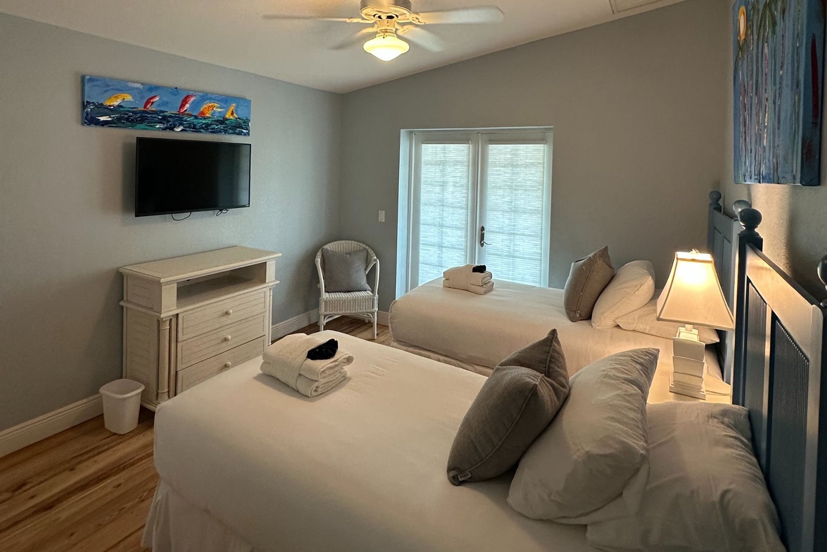 The primary suite features a king bed, flat screen TV, porch access, and a spa-inspired ensuite bath with a large walk-in shower, clawfoot tub, dual vanities, and private water closet. The second bedroom has a queen bed and the third bedroom offers two twin beds – both with flat screen TVs and private access to a porch. The shared hallway bathroom is thoughtfully designed with a split layout to help everyone get ready with ease. For added privacy, a hallway curtain can separate the guest bedrooms from the main living space.